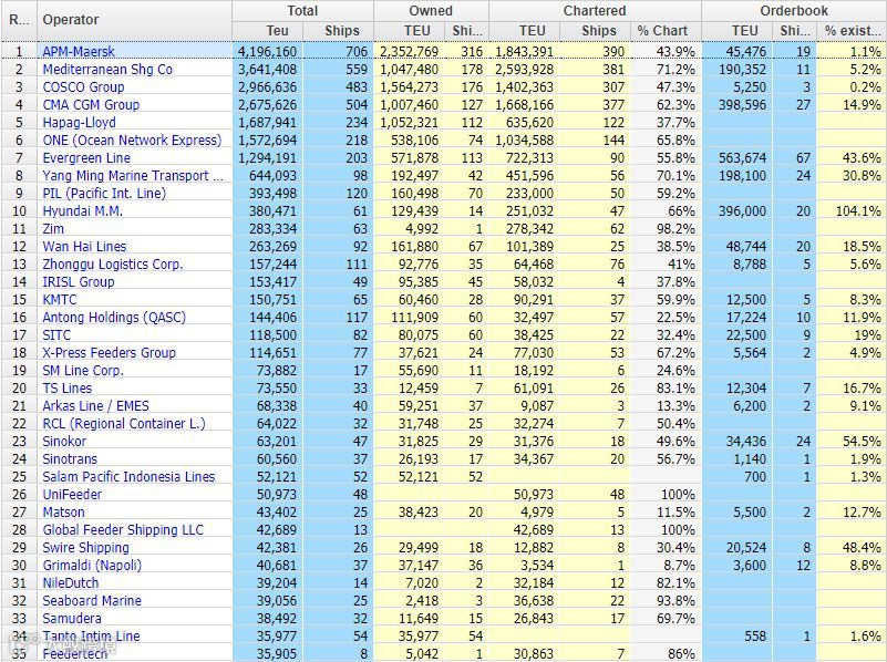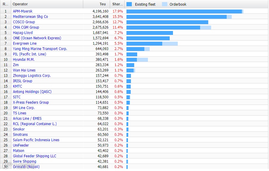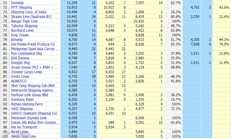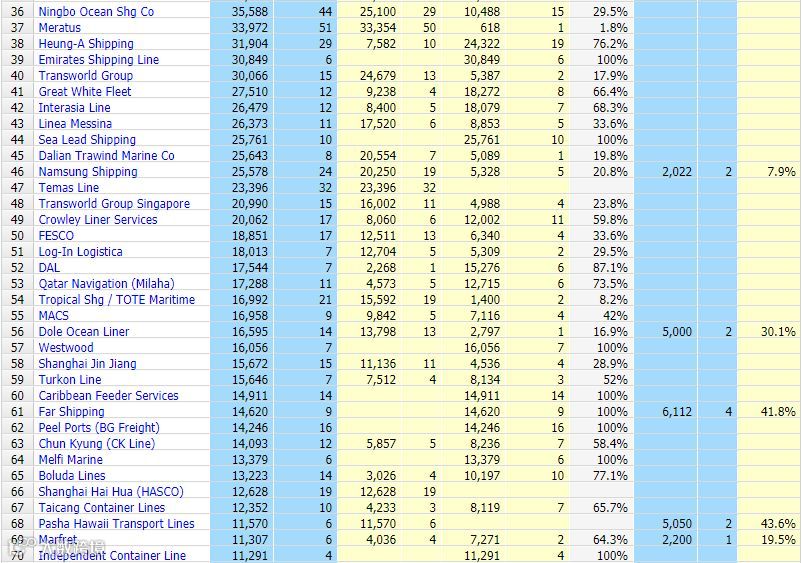 排名位列第十一至二十位的分别是:以星航运、万海航运、中谷物流、伊朗国航、高丽海运、安通控股、海丰国际、新加坡X-press、SM商船、德翔航运。中谷物流上升2位排名至第13位(15.7244万TEU),海丰国际上升 一位排名第17位。根据统计,排名前二十的集装箱班轮公司运力占全球的89.4%。