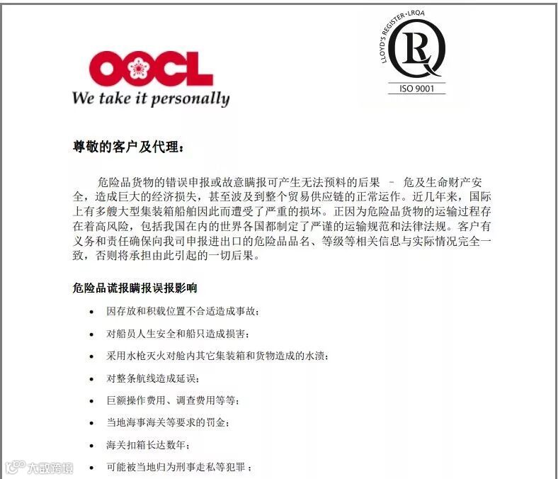 东方海外的通知,除了告知危险品订舱管理办法,也对危险品瞒报的影响、以及严重后果,做了详细的告知。建议货主货代们都再重温一下,看完保证你哪怕有一丝侥幸的小念头也立马会灭了!