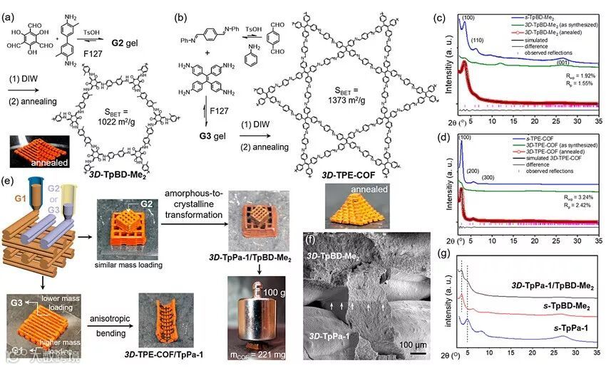 图3. (a)-(b)3D-TpBD-Me2和3D-TPE-COF整体的合成,(c-d)3D-TpBD-Me2和3D-TPE-COF的PXRD数据,(e)多组分3D-COF合成;100 g砝码下的221 mg 3D-TpPa-1/ TpBD-Me2 整体,(f)多组分3D-COF界面的SEM图,(g)多组分3D-COF的PXRD数据。图片来源:J. Am. Chem. Soc.