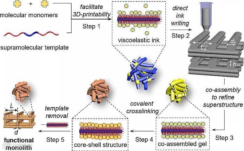 图1. 多级共组装增强墨水直写的设计原理。通过分子单体和模板分子之间的共组装形成墨水(步骤1)。3D打印后(步骤2),经历溶剂蒸发诱导的共组装(步骤3),然后进行共价交联(步骤4)和模板去除(步骤5),生产均匀的功能单块。图片来源:Angew. Chem. Int. Ed.