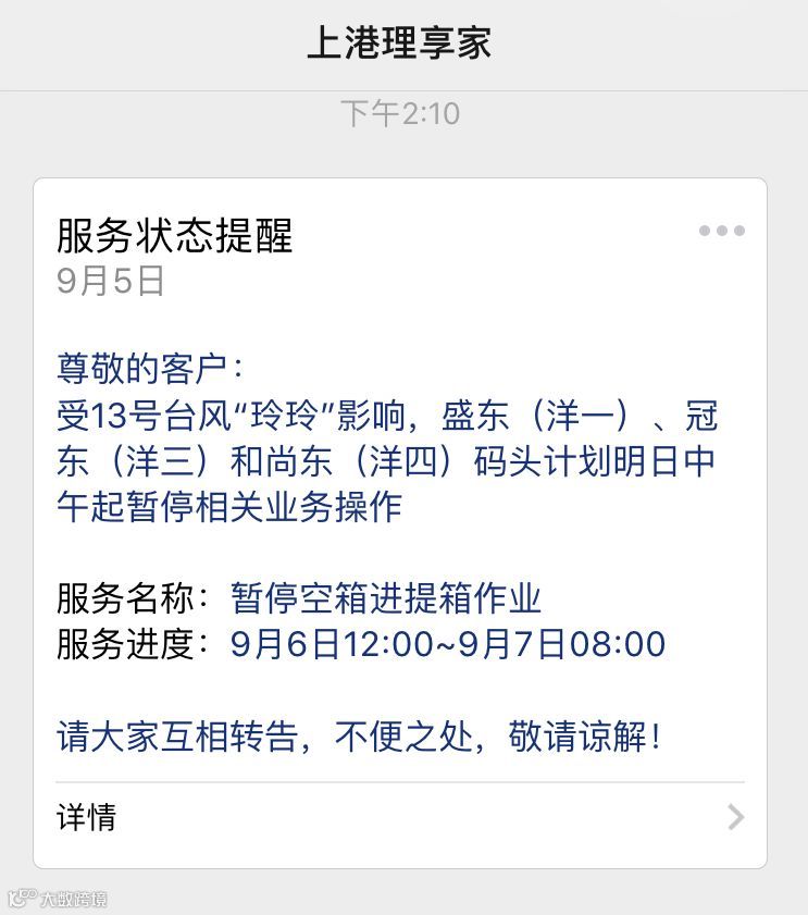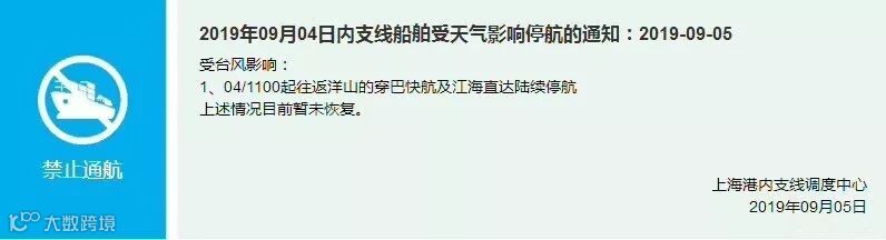 刚刚,上海港内支线调度中心发布通知:受台风影响:04/1100起往返洋山的穿巴快航及江海直达陆续停航,上述情况目前暂未回复。