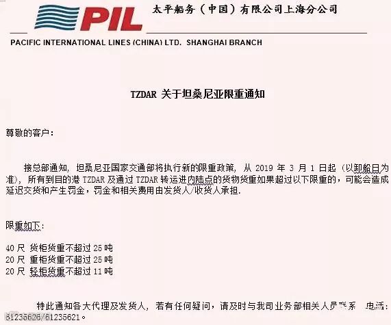 有出口到坦桑尼亚的外贸、货代朋友们注意了!坦桑尼亚国家交通部将从2019年3月1日起(以卸船日为准)执行新的限重政策,40尺货柜货重不超过25吨,20尺重柜货重不超过25吨,20尺轻柜货重不超过11吨,违者可能会造成延迟交货和罚金!罚金和相关费用由发货人/收货人承担。目前,船公司PIL已发布紧急通知,请大家互相转告!