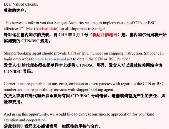 自2019年3月1号(抵达目的港日)起,塞内加尔当局将开始实施新的CTN/BSC规则。