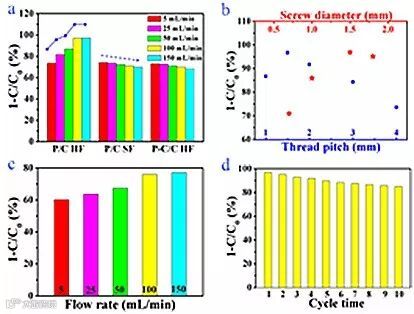 南京工业大学和东南大学的团队共同开发的压电-光催化复合螺旋纤维很好地弥补了上述缺陷。众所周知,自然界中的生物具有的自愈系统可以帮助其抵御外界的损伤或攻击,如果光催化剂也被赋予自愈能力,那么催化剂的光催化性能及耐久性将得到显著的提高。自然界中的植物可以通过自身藤蔓螺旋结构的伸缩变形来抵御风吹而不受损伤,那么将压电材料设计为螺旋结构将有利于其在自然条件下发生变形,产生压电势。基于此,研究团队创新性地设计了压电-光催化复合螺旋结构,实现了内建电场的自修复,对光生电子-空穴对的传输与分离产生持续的增益作用,提高光催化材料的本征效率达20%以上。研究团队探讨了流体变化、螺旋纤维的设计参数(如螺距、螺环)等与压电电场以及光催化性能的关联,并对复合螺旋纤维的光催化稳定性进行了探索。