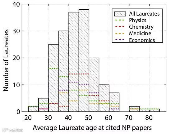 研究者发现,所有领域诺奖得主发表“诺奖论文”时的平均年龄为44.1岁。其中,物理学奖得主发表的“诺奖论文”平均年龄仅为42岁;经济学奖为43.9岁,晚了物理2年;生理学或医学奖为45.1岁,晚了物理3年;化学奖为46.5岁,晚了物理4.5年。