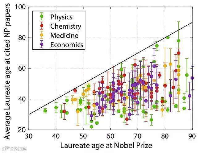 图4. 诺奖得主获奖年龄与发表“诺奖论文”年龄关系图。图片来源:Scientometrics [1]
