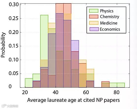 图2. 发表“诺奖论文”平均年龄的概率分布。图片来源:Scientometrics [1]