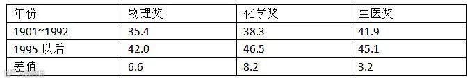 1993年有学者做过类似的研究 [2],与本文对比发现,现在发表“诺奖论文”比以前难多了。这一结果也很容易理解,现代科学的发展已经很难靠个别学者的单打独斗推动了,大部分有价值的工作都来自合作,项目周期明显变长。与1992年的数据相比,发表化学奖“诺奖论文”的年龄后移了整整8年,这可能与越来越多的化学奖授予了生物学家有关,众所周知,生命科学方面的研究周期更长。