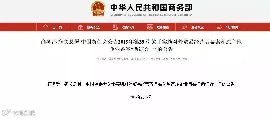 自2019年10月15日起,商务部、海关总署、中国贸促会将在全国范围内展开对外贸易经营者备案和原产地企业备案“两证合一”改革工作。