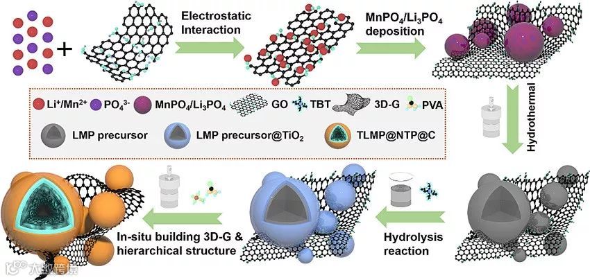 图1. TLMP@NTP@C/3D-G复合电极材料合成流程图展示。