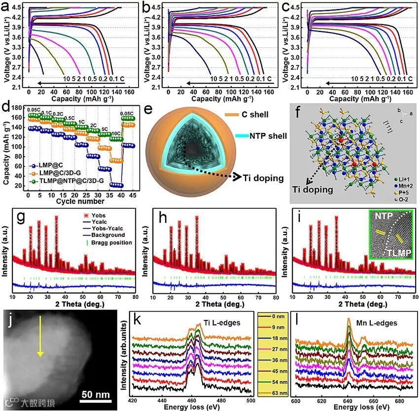 图2. TLMP@NTP@C/3D-G以及对比材料的电化学性能:(a-c)在0.1-10 C电流密度下的充放电曲线;(d)在0.1-10 C电流密度下的循环性能;(d)单核双壳结构TLMP示意图;(f)Ti掺杂LMP主体晶体结构示意图;(g-i)三种材料的XRD精修衍射图谱;(j-l)TLMP@NTP@C/3D-G颗粒的STEM及Ti和Mn对应的电子能量损失图谱。