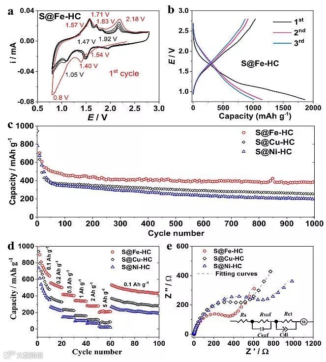 近年来,借助构建极性-极性相互作用,具有内部极性的硫载体被证明能够有效抑制多硫化物的溶解。目前报道的具有内部极性的硫载体主要有金属硫化物和金属氧化物。该工作创新性地研究了过渡金属纳米团簇对多硫化物的固定和转换作用。阿德莱德大学和卧龙岗大学团队通过将过渡金属(M = Fe, Cu, Ni)纳米团簇负载在空心碳球上,通过高温载硫而构建出具有极性的硫正极(S@M-HC)。在循环的过程中,极性位点在固定多硫化物的同时还可电催化多硫化物快速分解生成短链的硫化物,高效避免多硫化钠的溶解、流失,提高S的反应活性且有效地抑制“穿梭效应”。