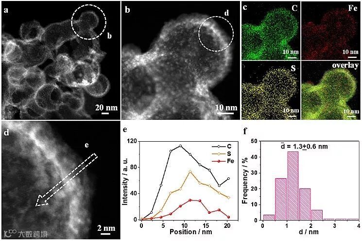 图1. S@Fe-HC的结构表征和铁纳米团簇的粒径统计图
