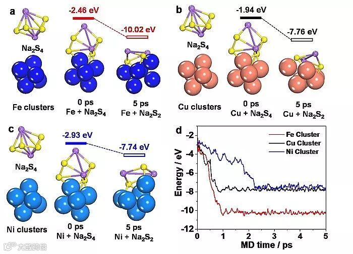 结构表征表明S和Fe纳米团簇(~1.3 nm)主要在负载在碳壁上,说明Fe的亲硫性促进了硫负载。同时线性分析的结果显示S的强度和Fe的强度呈线性关系,表明S能够和Fe形成Fe-S键(图一)。将三种材料进行电化学性能表征(图二),相比于S@Ni-HC和S@Cu-HC,S@Fe-HC正极表现出更高的可逆容量和循环稳定性。其首圈可逆容量高达1023 mAh•g-1,表明其产物是完全硫化的Na2S。在低电流(0.1 A•g-1)下长循环测试,经过1000圈的循环之后,S@Fe-HC的可逆容量可保持在394 mAh•g-1。借助于第一原理计算(图三),ab AIMD模拟结果表明长链的Na2S4在Fe纳米团簇上的吸附能最强,说明Fe纳米团簇对多硫化物有最强的固定作用。而且Na2S4在Fe纳米团簇经过1 ps就分解生成Na2S2,解离吸附能为-10.24 eV,按时多硫化物在其表面的反应活性是最高的,能快速催化多硫化向短链产物的转化反应。这一成果近期发表在Angew. Chem. Int. Ed. 上,文章的第一作者是张斌伟和盛天,通讯作者为阿德莱德大学的乔世璋教授和卧龙岗大学的王云晓博士。