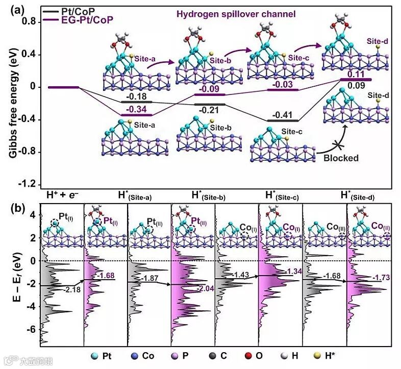 基于以上研究,作者提出了以下催化反应机理:引入EG使得Pt位点上(位点a,Pt-Pt桥位)的H*吸附更强并且在Pt/CoP界面位点处(位点b和位点c,Pt上和Pt-Co桥位)更弱,Pt位点上较强吸附有利于H*的富集,在Pt/CoP界面位点(位点b和位点c)的H*吸附自由能接近于零有利于H2的产生和脱附。重要的是,随着H*从Pt位点(位点a)到Co位点(位点d)的吸附逐渐变弱,形成了从Pt→Pt/CoP界面→CoP的氢溢流通道,使得通过EG和Pt簇富集的H*可被CoP有效利用以产生H2。EG富集的游离质子可以首先被稳定在邻近位点(位点a),然后基于吸附能的差异逐步转移通过界面位点到达CoP表面,而CoP表面为H2的形成和释放提供了丰富的理想位点。