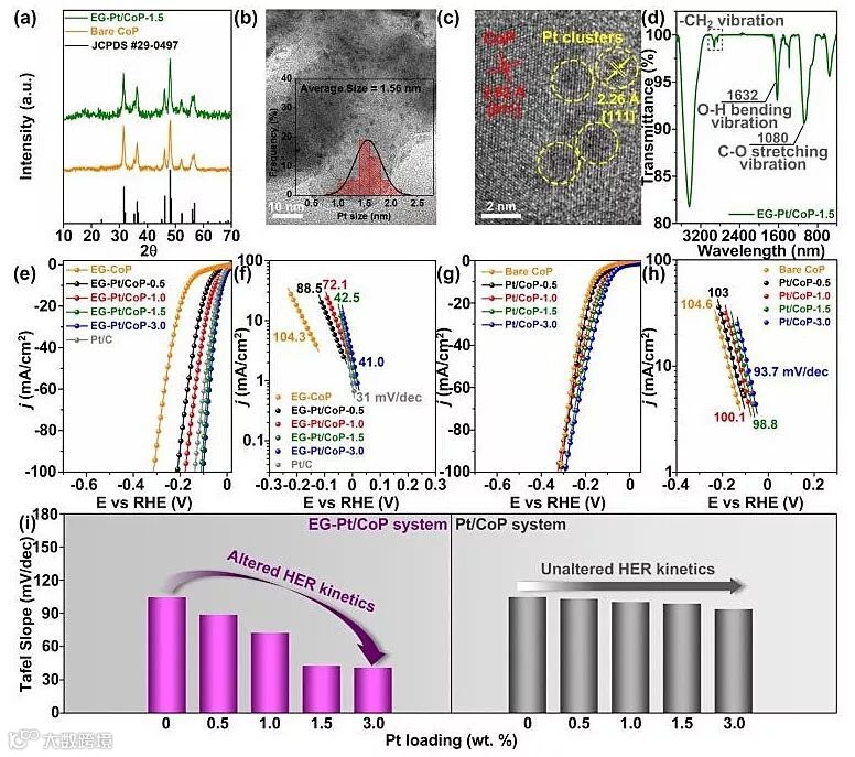 作者首先制备Co(OH)2纳米片,随后用NaH2PO2使Co(OH)2磷化以得到CoP纳米片(图1a),最后通过EG原位还原H2PtCl6在CoP负载上Pt纳米颗粒。通过调整的H2PtCl6的用量,可以将催化剂中Pt负载量控制在0.5 wt.%、1.0 wt.%、1.5 wt.%和3.0 wt.%。这些催化剂被命名为EG-Pt/CoP-x(x代表Pt负载量),例如EG-Pt/CoP-1.5。X-射线衍射及电镜等表征结果表明,CoP纳米片的相和结构在负载Pt纳米颗粒前后并没有明显变化;Pt纳米颗粒负载均匀,各种负载量的催化剂Pt颗粒尺寸相近(约1.56 nm)(图1b);EG-Pt/CoP-1.5中Pt (111)面和CoP (011)面的晶面间距分别为2.26 Å和2.82 Å(图1c)。而红外光谱也显示EG的特征峰(图1d),证实了在复合催化剂中存在EG。