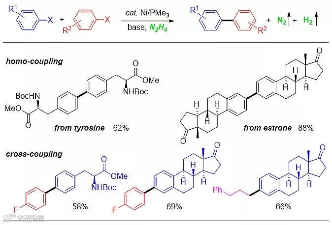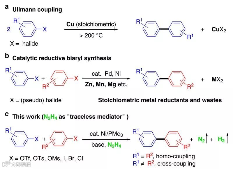 经典的Ullmann还原偶联使用当量的金属Cu作为催化剂,反应需要在高温(> 200 ℃)下进行(Scheme 1a)。后来科学家们发现催化量的Pd或Ni存在时,使用当量的活泼金属(Mg、Mn、Zn等)作为还原剂,芳基卤化物及类卤化物可以在温和条件下实现双芳基的偶联反应(Scheme 1b)。2015年,Weix课题组在这一研究领域取得了突破性进展,他们使用当量的Zn作为还原剂,实现了首例Pd/Ni双金属协同催化的高效交叉Ullmann偶联反应。然而,活泼金属还原剂在反应完成后会产生大量金属盐废弃物,不但导致反应后处理过程复杂,而且容易引起环境污染问题。加拿大麦吉尔大学李朝军研究团队长期致力于绿色环保的有机化学合成及转化。近日,该课题组报道了一种绿色环保的Ullmann还原偶联反应(Scheme 1c)。该反应的创新之处是使用N2H4作为还原剂代替活泼金属,反应副产物仅为N2和H2,这一发现解决了长期以来Ullmann还原反应所产生的当量固体废弃物及由此引起的环境污染问题。