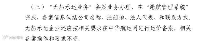 同时,“无船承运业务”备案业务办理,可在“港航管理系统”完成,备案信息包括公司名称、注册地、法人代表和联系方式。此外,无船承运企业还应按相关要求,在中华航运网进行运价备案,相关备案操作和要求不变。