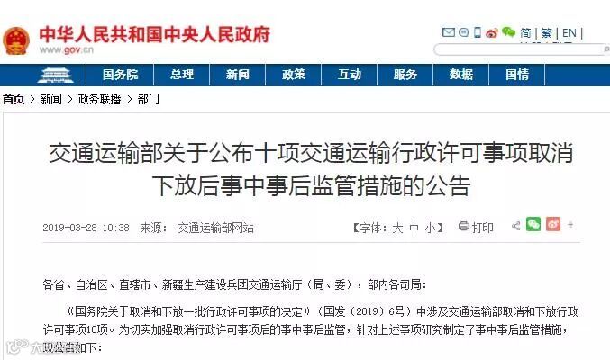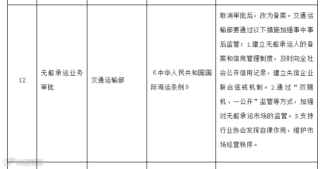 对此,政府部门也进行了相关调整。3月28日,交通运输部公布十项交通运输行政许可事项取消下放后事中事后监管措施的公告,取消“无船承运业务审批”后,交通运输部将加强无船承运企业备案管理,省级交通运输主管部门将定期对外公布本省无船承运企业名单,做好动态管理。通过“双随机、一公开”监管等方式,省级交通运输主管部门要组织对本省无船承运业务经营者的运价备案和执行情况检查。