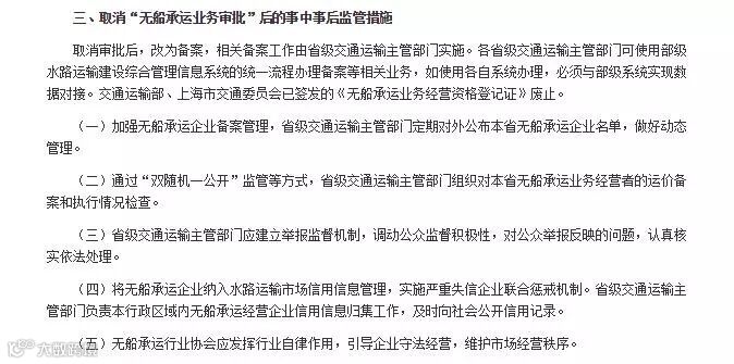 根据国务院发布的《关于取消和下放一批行政许可事项的决定》,无船承运业务取消审批,改为备案。交通运输部将建立无船承运人的备案和信用管理制度,及时向全社会公开信用记录,建立失信企业联合承接机制。通过“双随机、一公开”监管等方式,加强对无船承运市场的监管,支持行业协会发挥自律作用,维护市场经营秩序。