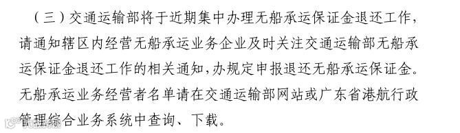 日前,广东省交通运输厅也发布通知称,交通运输部将于近期集中办理无船承运保证金退还工作,企业需及时关注交通运输部相关通知,按规定申报退还无船承运保证金。