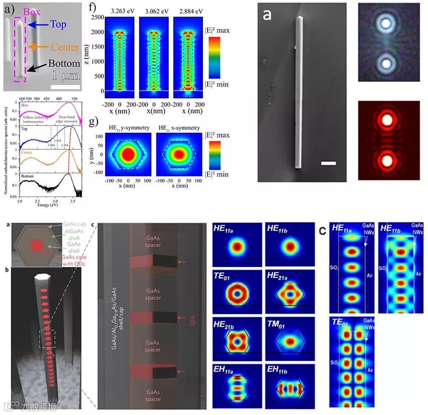 图 5. 上左: GaN纳米柱内部的光学共振导致其光谱的多峰特性 (Nano Letters | 10.1021/acs.nanolett.6b00484);上右:InGaAs超晶格纳米线的远场干涉纹样 (Nano Letters | 10.1021/acs.nanolett.7b05015);下:GaAs超晶格纳米线的共振模式与激光激励分析 (Nature Photonics | 10.1038/NPHOTON.2015.111)。
