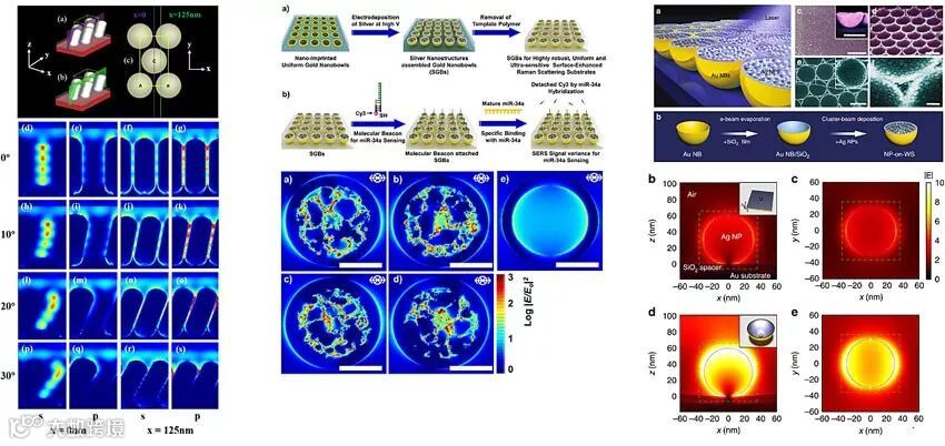 图 4. 利用全电磁场数值模拟辅助设计金属纳米结构在SERS中的应用。左:Nanoscale | 10.1039/C8NR01198,中:Nanoscale | 10.1039/C7NR08066B,右: Nature Communications | 10.1038/s41467-018-07869-5