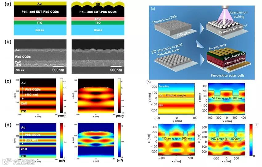 图 1. 左:通过FDTD数值模拟为量子电薄膜电池设计表面光学结构(Nano Letters | 10.1021/acs.nanolett.6b05241);右:通过全电磁场数值模拟为钙钛矿太阳能电池设计2D光子晶体电极层(Nano Energy | 10.1016/j.nanoen.2018.11.050)。
