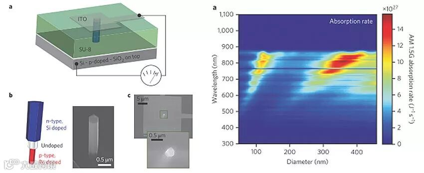 图 2. 基于单纳米线的GaAs太阳能电池。通过基于器件模拟的光学设计获得了获得超越Shockley–Queisser极限的器件转换效率(Nature Photonics | 10.1038/NPHOTON.2013.32)。