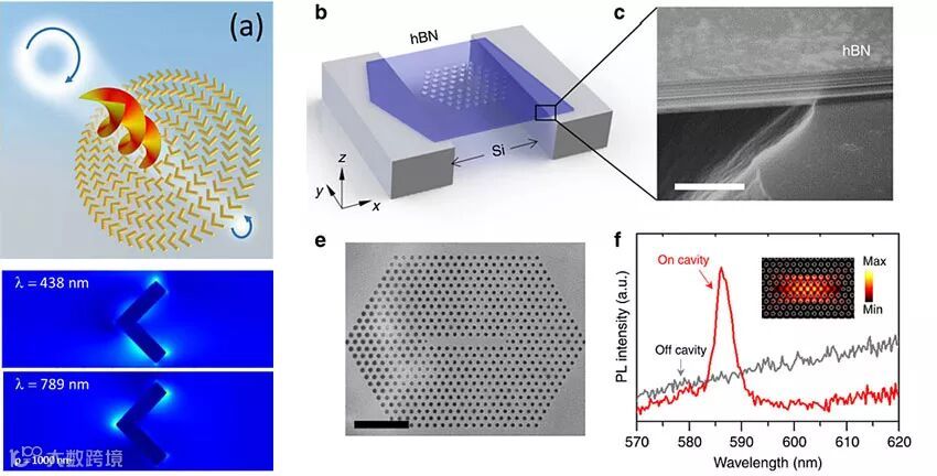 在传统微纳光学器件设计领域,由于采用了先进的全电磁场模拟技术,研究人员也可以更加从容的处理一些更为复杂、性能要求更严苛的光学系统,以提供各种特异性的光学性能。例如复旦大学的研究人员使用以电磁场数值模拟为他们的等离子体超颖表面的设计提供了更为全面的细节分析 (Nanoscale | 10.1039/C8NR02088D)。这种超颖表面可以有效的将高斯光速转换为光涡,其理论转换效率可以超过40%,并且具有良好的宽频特性。下面这篇来自澳大利亚悉尼科技大学的研究成果(Nature Communications | 10.1038/s41467-018-05117-4)也是采用以数值模拟技术辅助为主的器件设计方法,开发出可用于量子电动力学(QED)实验的高性能六角氮化硼光子晶体共振腔,其共振品质因子可以超过2000,并表现出对加工工艺不敏感的特性。