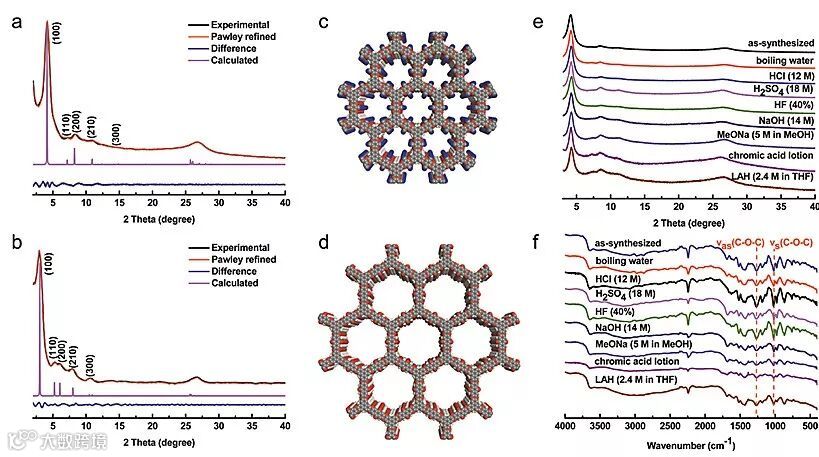 同时其能够在包括沸水、强酸(12 M盐酸、18 M硫酸、40%氢氟酸)、强碱(14 M氢氧化钠、5 M甲醇钠/甲醇溶液)、强氧化剂(铬酸溶液)、强还原剂(2.4 M氢化铝锂/四氢呋喃溶液)等苛刻的条件下保持稳定,其稳定性超过了所有已知的结晶多孔材料(包括金属有机骨架材料、分子筛和其他COFs)。