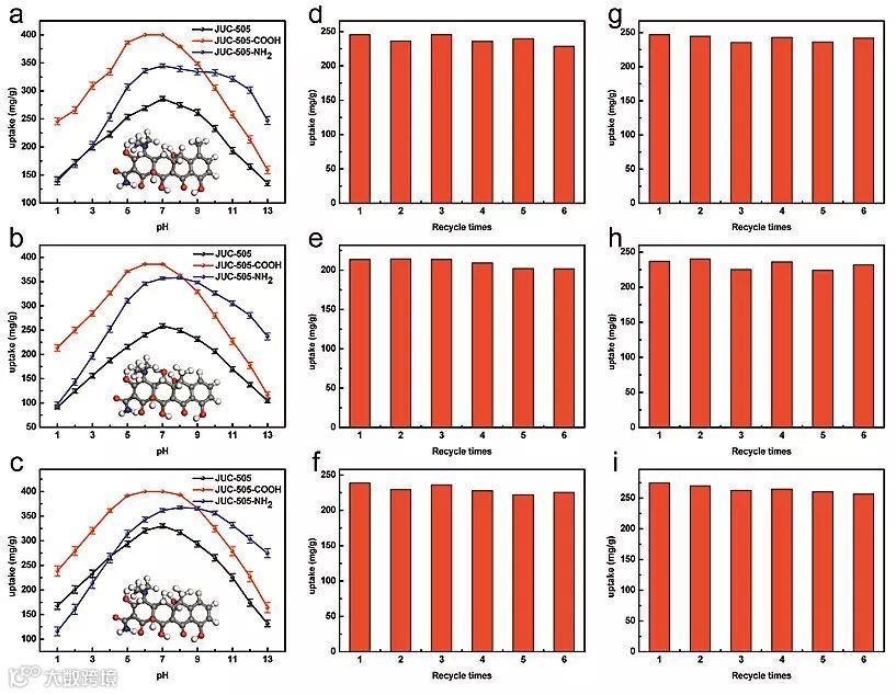 基于JUC-505的高化学稳定性,研究者还对其进行了后修饰。通过将JUC-505分别在20%氢氧化钠(水/乙醇 = 1/1)和2.4 M氢化铝锂(四氢呋喃)中回流,得到了羧基功能化的JUC-505-COOH和氨基功能化的JUC-505-NH2。他们将JUC-505及其两种衍生物用于污水中抗生素的吸附,发现其对四环素、土霉素和金霉素在广泛的pH范围(pH = 1~13)内具有较高的吸附,且经过5次吸附-脱附循环后吸附量没有明显的降低。