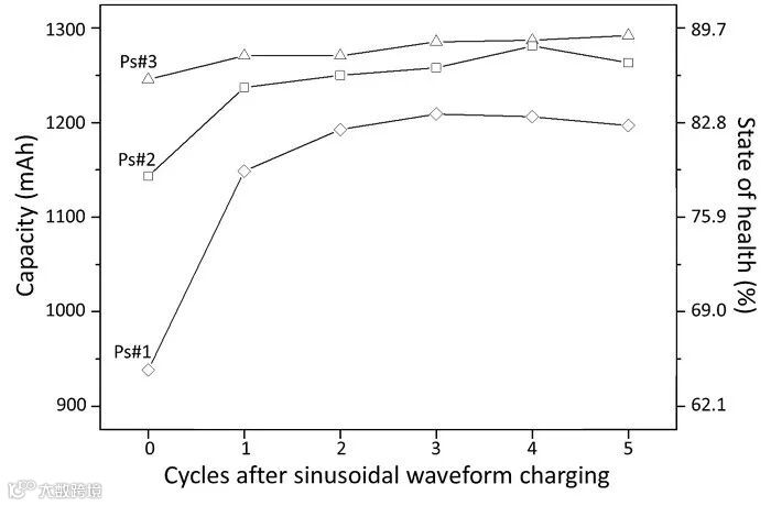 另外,對於從電動車上汰役下來的電池以弦波充電法充電,也能夠提升最多18.7%的電容量。弦波充電於充電過程中,電池溫度上升最多9 °C,且充電時間僅需傳統CC-CV充電法時間的一半,其表現皆優於傳統CC-CV充電法。