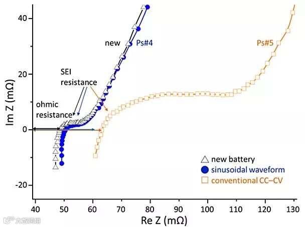 为验证弦波充电法对于电池内部SEI膜阻抗的影响情形,研究人员利用电化学阻抗图谱(EIS)对电池进行分析,结果显示使用此充电法进行600次循环后的电池比起使用传统CC-CV的电池,有效抑制了SEI膜的成长,并能保持与全新电池内部阻抗相近的水平,说明此充电法对于锂离子电池内部材料结构的破坏情形较小,而能提供电池更长的使用寿命,故此充电法将提供锂离子电池产品使用者更好的选择。