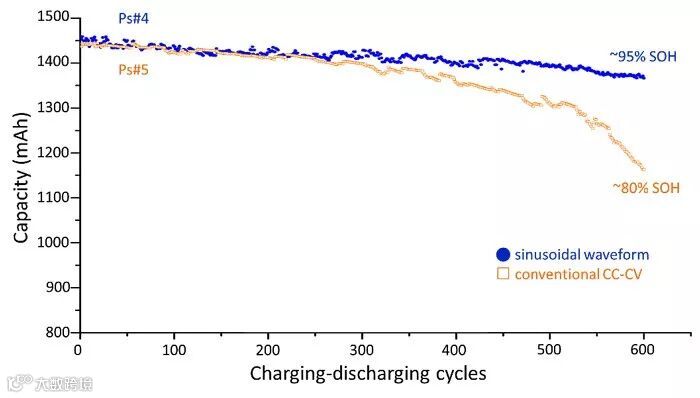 研究人员以电动车用电池容量低于80%就需汰换的标准,来比较弦波充电法与传统CC-CV充电法的电池电容量,并对电池以大电流充放电的方式来模拟电动车使用情境,由实验结果可发现传统CC-CV充电法于600次循环后就达80%容量,而使用弦波充电法的电池还有剩余95%的电容量,说明弦波充电法对于电池使用寿命上有延长的功效。