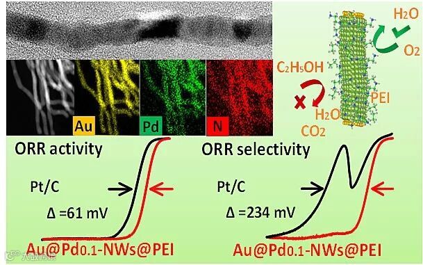 近日,陕西师范大学陈煜教授课题组采用简便络合-还原法成功制备出聚乙烯亚胺(PEI)功能化的Au@Pd核@壳结构纳米线(Au-NWs@Pd@PEI,图1),该催化剂对ORR表现出超高的电催化活性、稳定性和选择性。在这个体系中,PEI充当了络合剂、表面活性剂和电子调节剂的作用。在反应过程中,PEI与Pd前驱体络合,降低Pd前驱体的还原速率,使其均匀包覆在Au纳米线(Au-NWs)上,起到了络合剂和表面活性剂作用;PEI也起到了电子调节剂的作用,PEI中给电子基团-NH2与Au和Pd原子相互作用,导致Pd 3d和Au 4f的结合能同向负移,同步改变Au和Pd的电子结构。另外,在Au-NWs@Pd@PEI无机-有机纳米复合物表面的PEI松散吸附层有效充当“分子窗纱”,物理阻碍比O2分子尺寸更大的醇分子接触催化剂表面,从而实现了催化剂的ORR选择性,有效提升阴极ORR催化剂的耐醇性(图1)。