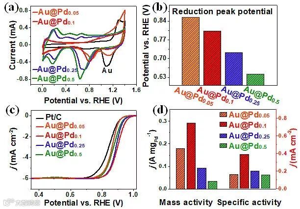 电化学测试表明Au表面上的Pd壳厚度影响ORR活性(图2)。当Pd投料量过少时,Pd壳并不能完全包覆Au-NWs;当Pd投料量增加,Pd壳完全包覆在Au-NWs表面,Pd氧化物的还原峰电位随着Pd壳厚度的减小而正向移动,这表明Au-NWs@Pd@PEI无机-有机纳米复合物上薄Pd壳表面上的羟基吸附/解吸发生在更高的电位上,有利于增强ORR活性。