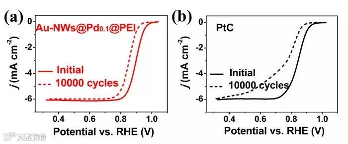 图3. Au-NWs@Pd0.1@PEI和Pt/C的ORR稳定性。