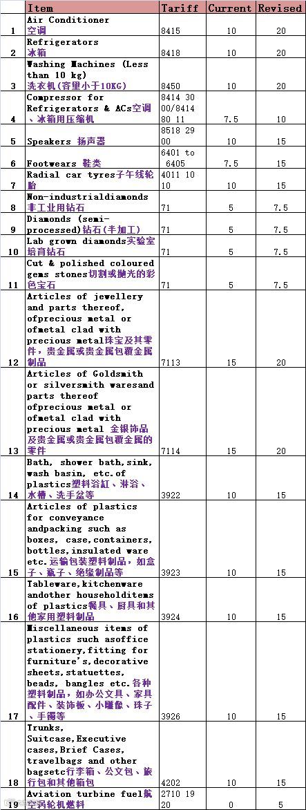 印度财政部决定自9月27日起提高洗衣机、空调、钻石、航空燃油等19种商品的进口关税。其中,空调、冰箱、洗衣机的进口税率从10%提高20%;航空燃油进口税率从零提高至5%。印度财政部表示,在2017—18财年,这19种商品印度进口总额达8600亿卢比。
