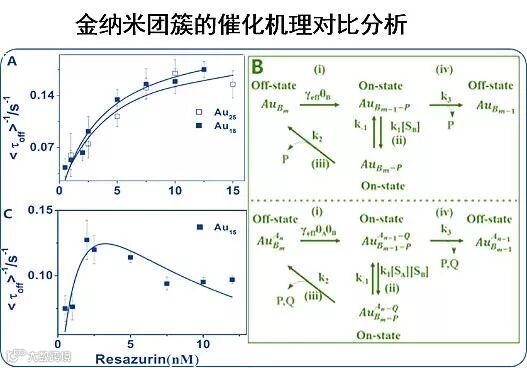 针对该基础科学问题,中科院长春应化所徐维林课题组基于新加坡国立大学谢建平课题组提供的一系列含有不同精准原子个数的金原子团簇,采用单分子单纳米粒子荧光显微技术对单个金原子团簇上的反应过程进行了微观层面的解析,发现对于不同原子数的原子簇催化剂,其活性差异很大,体现在不同大小的金团簇上有不同的催化机理反应物/产物吸脱附能力。该团队利用纳米金催化盐酸羟胺还原Resazurin的反应,对Au15(MPA)13、Au18(MPA)15、Au25(MPA)18单粒子催化动力学信息进行了详细解析。结果发现,对于Au15(MPA)13原子团簇,其催化过程呈现出竞争性的Langmiur–Hinselwood机理,即随着底物浓度增加,反应速率出现一个峰值。而对于Au18(MPA)15和Au25(MPA)18,像常规大的纳米粒子一样,其催化呈现出非竞争性的Langmiur–Hinselwood机理,即反应速率随着底物增加逐渐达到饱和值。研究团队进一步发现,这种几个原子导致的巨大催化特性差异可归属为金原子团簇独有的量子尺寸效应。