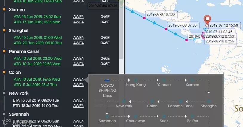 “COSCO DEVELOPMENT”曾挂靠深圳盐田、厦门、上海等多个港口,驶往美国东海岸,包括COSCO、CMA、Evergreen等多家船公司共舱。