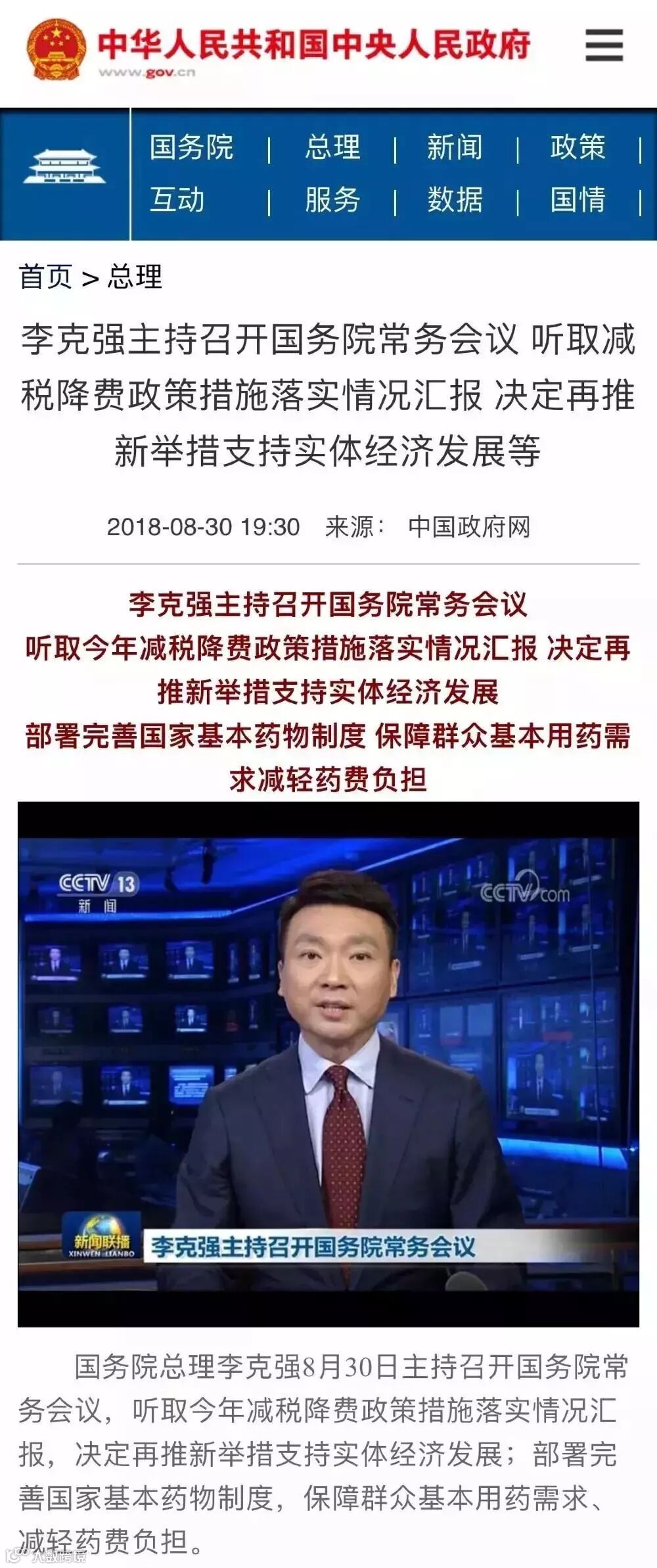 在刚刚召开的国务院常务会议上,国务院总理听取今年减税降费政策措施落实情况汇报,决定再推新举措支持实体经济发展;部署完善国家基本药物制度,保障群众基本用药需求、减轻药费负担。
