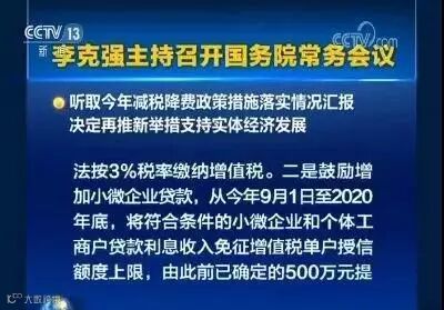 会议鼓励增加小微企业贷款,从今年9月1日至2020年底,将符合条件的小微企业和个体工商户贷款利息收入免征增值税单户授信额度上限,由此前已确定的500万元进一步提高到1000万元。