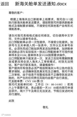 据一位业内人士透露,此次收费也是无奈之举。自11月1日,新舱单政策实施后,操作工作量显著增大,晚上、周末加班成为常态。不收费的话,实在无法平抑人力成本的增加。