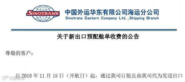 日前,作为华东地区主要的订舱口之一,中国外运华东有限公司海运分公司正式宣布,将从11月15日(开航日)起,收取舱单传输服务费。如舱单发送后的更改、删单等特殊操作,则将收取舱单传输更改费。
