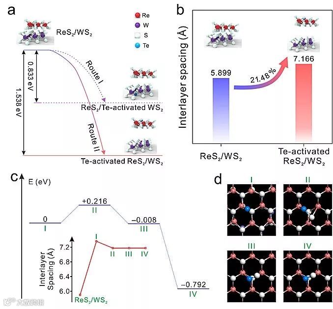 该团队以ReS2/WS2异质结为例,发现Te DPs会与异质结结合,使ReS2与WS2相互作用变弱,从而在基底上原位得到WS2,在下游得到ReS2。一系列的表征手段如拉曼光谱、光致发光光谱、原子力显微镜等的实验结果也证明了这一点。事实上,Te DPs与异质结结合有两种可能的途径,一种与WS2结合(Route I),一种与ReS2结合(Route II),计算发现,Route II能量降低得更多,说明Te DPs更倾向于与ReS2结合,同时也说明该法在热力学上是可行的。作者还进一步证明了层间范德华相互作用减弱是另一个导致去组装的重要步骤,经研究发现,Te DPs与ReS2结合后使层间距扩大了21.48%,这为异质结的去组装提供了极大的可能性。此外,为了进一步验证Te DPs的选择性,单层WS2在相同条件下被碲化,结果仍然保持高度的均一性,这表明了Te DPs不与WS2层结合。除了ReS2/WS2异质结,其他的2DVHs如石墨烯/WS2异质结也可以发生类似的去组装行为,证实了这一方法的普适性。