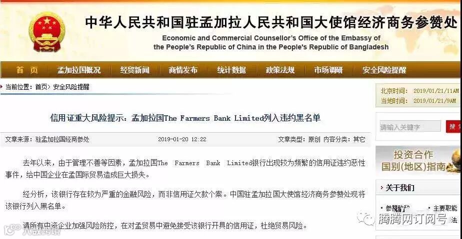 去年以来,由于管理不善等因素,孟加拉国The Farmers Bank Limited银行出现较为频繁的信用证违约恶性事件,给中国企业在孟国际贸易造成巨大损失。2019年1月20日,中国驻孟加拉国大使馆经济商务参赞处在官网上发布安全风险提醒,正式将该银行列入黑名单。