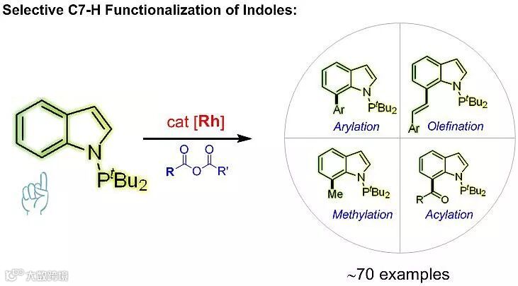 最近,南京大学的史壮志教授课题组设计了一种大位阻三级膦(PtBu2)导向基团安装在吲哚氮原子上,在铑催化下和羧酸、酸酐反应,可以实现吲哚7号位系列碳氢官能团化反应。该课题组发现,在吲哚氮原子安装PtBu2基团后,三价膦原子可以跟一价铑配位,可选择性的将铑导向到吲哚的7号位进行金属化,形成一个热力学、动力学都有利的五元铑环过渡态中间体,其成环趋势远远大于在吲哚2号位金属化的四元环过渡态。通过与不同类型的羧酸/酸酐作为偶联试剂反应,可以选择性地实现吲哚C7位点的脱羰基芳基化、烯基化以及甲基化反应。众所周知,吲哚C3位点的傅-克酰基化反应是非常经典的有机转化。通过控制反应温度,该体系可以实现羰基保留,得到吲哚C7-酰基化产物,打破了传统酰基化的区域选择性。更重要的是,生成的产物在四丁基氟化铵溶液中,可以快速实现脱保护得到N-H吲哚。