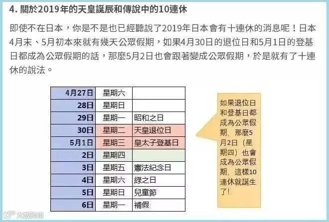 但是,今年日本的黄金周有点特殊,由于适逢老天皇退位,新天皇登基这两件大事,这次日本很有可能会“十连休”,也就是一口气放假十天!