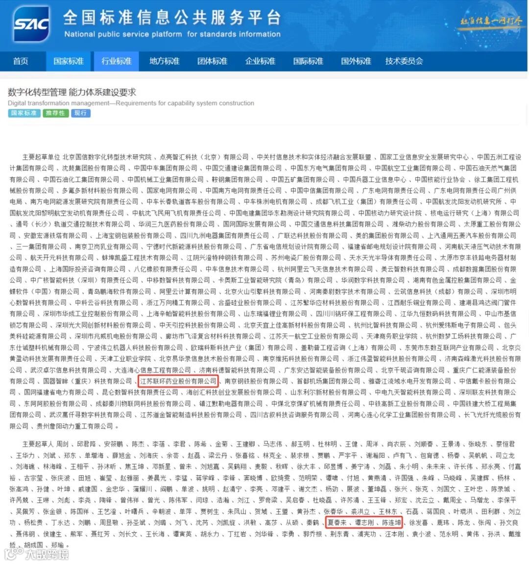近日,国家市场监督管理总局(国家标准化管理委员会)发布公告,批准《数字化转型管理能力体系建设要求》(GB/T 45988-2025)正式发布。联环股份作为主要起草单位之一,参与此项国家标准的制定。